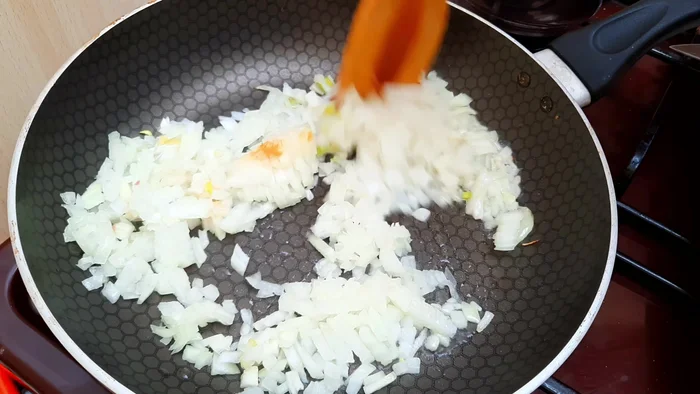 - Faire revenir les oignons, puis ajouter la viande hachée, le sel et le poivre.