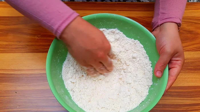 - Incorporer progressivement l'eau froide jusqu'à obtenir une pâte qui se rassemble.