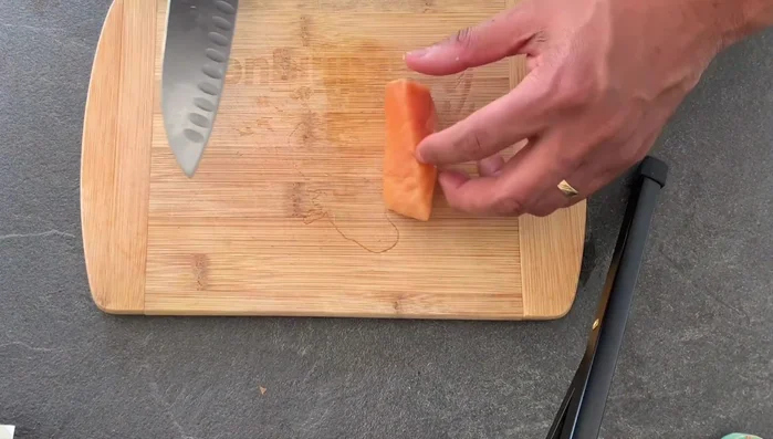 - Couper le saumon fumé en fines tranches pour la décoration et en petits dés pour l'intérieur des œufs.