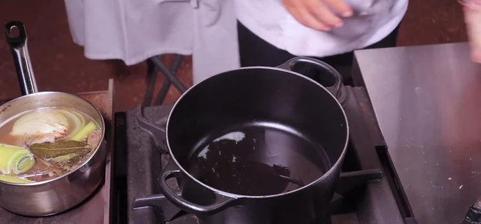 - Faire revenir les abats et les ailes de pigeon dans la graisse de canard (ou huile/beurre). Ajouter les légumes (oignon, carotte, céleri, poireaux), les herbes (laurier, thym), l’ail et le poivre. Couvrir d'eau.
