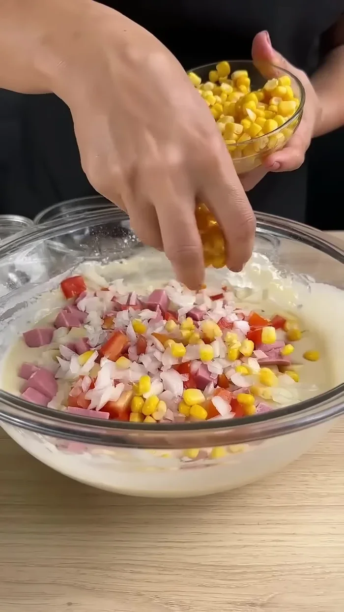 - Ajoutez le jambon (coupé en petits dés), mélangez pour une répartition homogène.